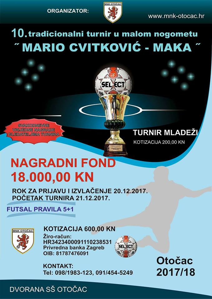 OTOČAC – U organizaciji MNK Otočac i ove godine održati će se 10.tradicionalni turnir u malom nogometuMario Cvitković – Maka“. Turnir će se održati  u sportskoj dvorani Srednje škole Otočac. Prijaviti se može do 20. prosinca. Turnir započinje 21. prosinca 2017, a kotizacija iznosi 600 kn.