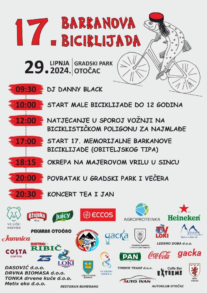 OTOČAC – U organizaciji BK Barkan u subotu, 29. lipnja 2024. održati će se 17. Barkanova bicikiljada. Mjesto okupljanja je dobro poznati gradski park, a polazak Memorijalne Barkanove biciklijade je predviđen za 17:00 sati. Voziti će se 34 km po ravnom dijelu uz rijeku Gacku sa stajanjem na Majerovom vrilu uz okrepu.