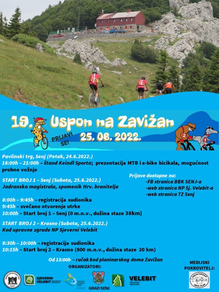 U organizaciji JU NP Sjeverni Velebit, BBK Senj, Grad Senj, TZ Grada Senja i JU PP Velebit, rekreativna biciklistička utrka 19. Uspon na Zavižan 2022. (od 0 do 1594 m n.v.) održati će se 25. lipnja 2022. godine (subota).