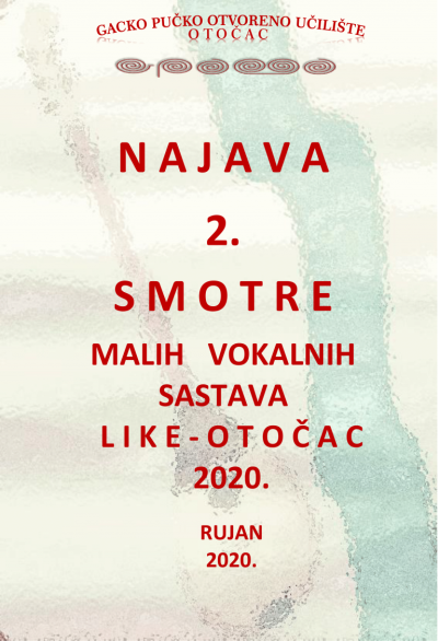 OTOČAC – Gacko pučko otvoreno učilište organizira 2. Smotru malih vokalnih sastava Like koja će se održati u Otočcu 13. rujna 2020. u velikoj dvorani GPOU-a s početkom u 19 sati. Smotra će okupiti ženske, muške i mještovite pjevačke skupine s područja Ličko-senjske županije koje će se natjecati u tri kategorije. Zainteresirani sudionici prijaviti se mogu do 24. kolovoza.