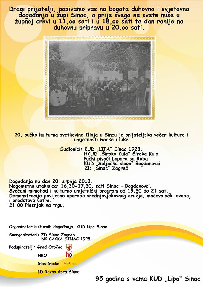 OTOČAC / SINAC – Svetkovina Ilinje, odnosno blagdana sv. Ilije proroka u Sincu proslaviti će se 20-tu godinu za redom. Organizator kulturnih događanja je KUD “Lipa” uz suorganizaciju ZD-a “Sinac” iz Zagreba te NK-a Gacka Sinac 1925. Događanje će započeti 20. srpnja misama u 11:00 i 18:00 sati u župnoj crkvi, dok će duhovna priprava biti dan ranije s početkom u 20:00 sati.