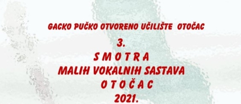 OOTČAC – Gacko pučko otvoreno učilište Otočac organizira 3. Smotru malih vokalnih sastava Otočac 2021.g., koja će se održati u nedjelju,17. listopada 2021.g. u velikoj dvorani Gackog pučkog otvorenog učilišta Otočac s početkom u 17 sati. Nastupiti će sedam vokalnih sastava iz LSŽ-e u tri kategorije, a sudjelovati će: