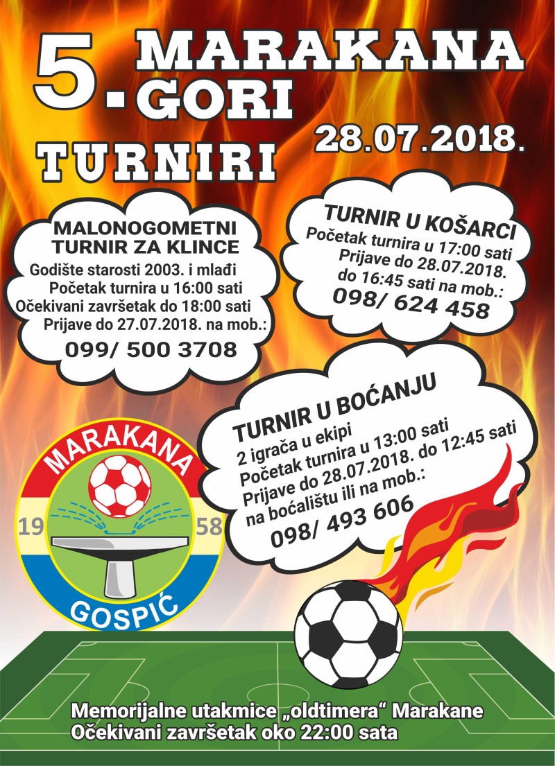ovim putem Vas ispred Udruge građana „Marakana Gospić“ pozivamo i ujedno obavještavamo da će se dana 28. srpnja 2018. godine (subota) povodom obilježavanja Dana Grada Gospića na Trgu Zrinskih i Frankopana u Gospiću održati tradicionalni turniri u organizaciji UG „Marakana Gospić“, a sve pod nazivom „5. Marakana gori“.