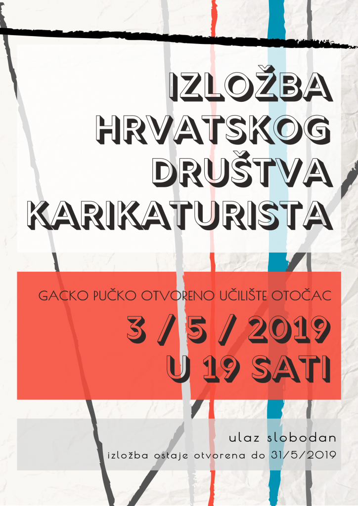 OTOČAC – Izložba Hrvatskog društva karikaturista bit će otvorena u izložbenoj dvorani Gackog pučkog otvorenog učilišta Otočac 3. svibnja 2019. u 19 sati. Na izložbi će biti predstavljeni radovi četrdesetak autora, tj. članova Hrvatskog društva karikaturista, a neki od njih karikature će izrađivati i na otvorenju izložbe.