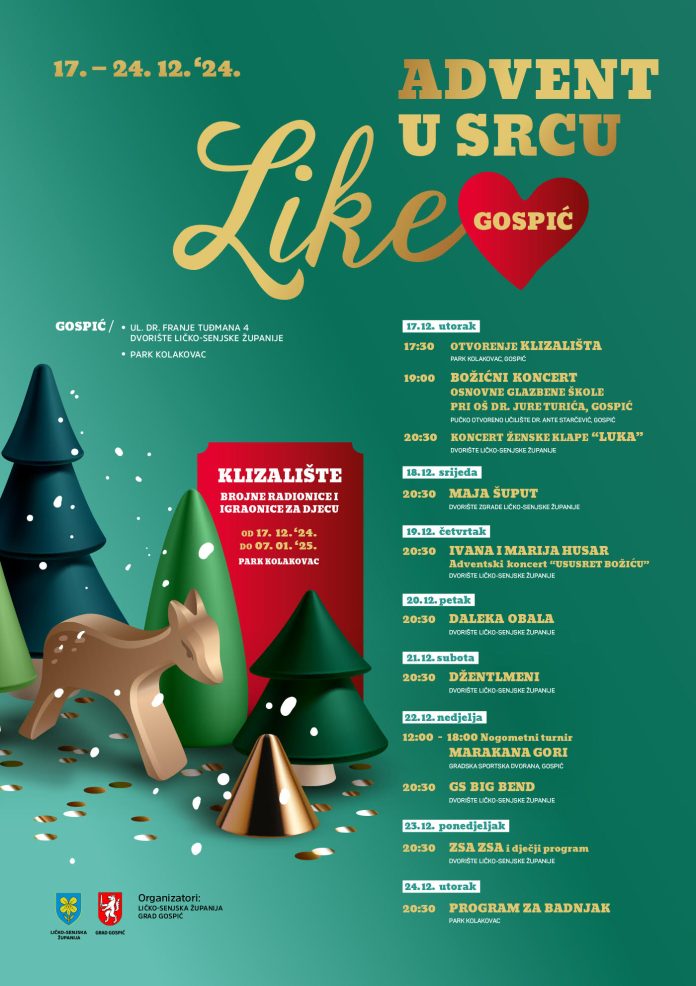 Gospić će ove godine zasjati u punom sjaju kroz bogat program „Adventa u srcu Like – Gospić“, koji će se održavati od 17. do 24. prosinca. Organizatori, Ličko-senjska županija i Grad Gospić, pripremili su raznovrsne događaje koji će oduševiti sve posjetitelje.