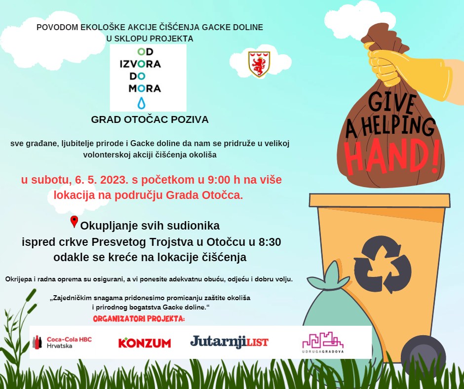 OTOČAC – Povodom ekološke akcije čišćenja Gacke doline u sklopu projekta “Od izvora do mora”, Grad Otočac poziva sve građane, ljubitelje prirode i Gacke doline da se pridruže ovoj velikoj volonterskoj akciji čišćenja okoliša. Okupljanje svih zainteresiranih sudionika biti će u subotu, 6. svibnja 2023. u 8:30 sati ispred crkve Presvetog Trojstva, a odakle će se krenuti dalje prema lokacijama čišćenja. Okrijepa i radna oprema su osigurani.