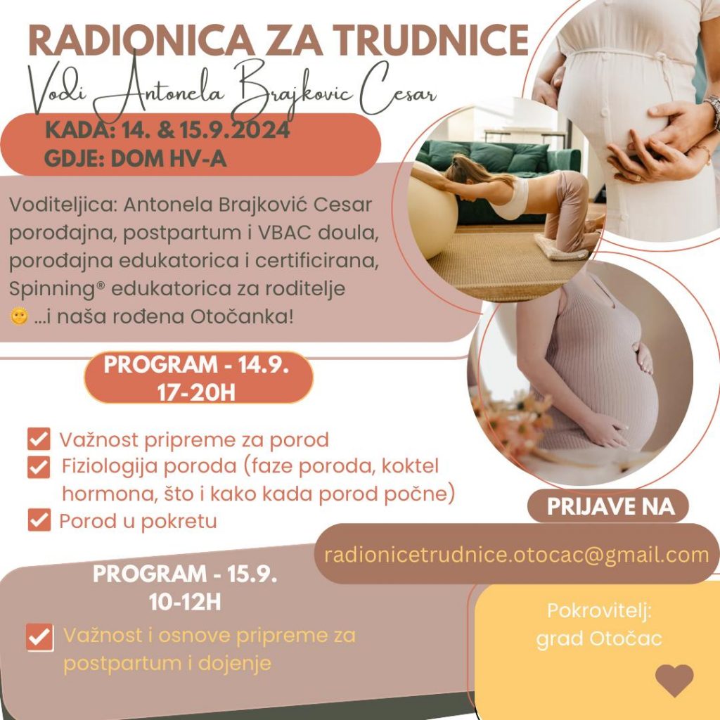 OTOČAC – Besplatna radionica za trudnice održati će se 14. i 15. rujna u Domu HV-a, (Bana Josipa Jelačića 16, Otočac), a voditi će je certificirana edukatorica Antonela Brajković Cesar. Radionica će budućim majkama pružiti sve potrebne informacije i podršku tokom trudnoće i pripreme za porođaj. Broj mjesta je ograničen, a rezervacije mjesta primaju se putem maila na radionicetrudnice.otocac@gmail.com. Pokrovitelj radionice je Grad Otočac.