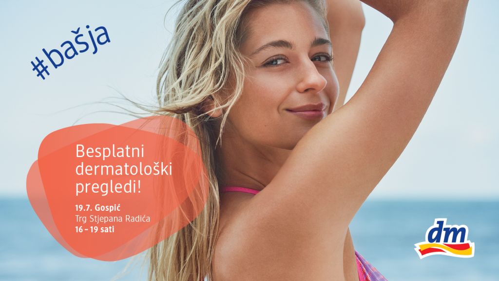 GOSPIĆ – U subotu 19. srpnja, na Trgu Stjepana Radića ,održati će se besplatni dermatološki pregledi u sklopu dm-ove inicijative „Zaštiti se…i uživaj na suncu“, čiji je cilj educirati što veći broj ljudi o zaštiti od UV zračenja te ih potaknuti na preventivne preglede kože.