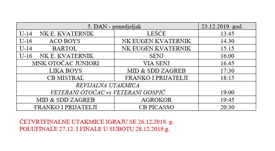 Osim revijalne utakmice veterana Otočca i Gospića koja će se odigrati sutra, 23. prosinca, četvrtfinalne utakmice odigrati će se 26. prosinca (subota), dok se polufinale i finale igraju 27. i 28. prosinca.