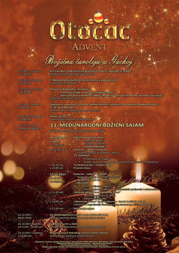 OTOČAC – pripreme za Advent u Otočcu privode se kraju. Događanja je na pretek te svatko može ponešto pronaći za sebe. Biti će tu raznih predstava za djecu povodom sv. Nikole, međunarodnih konferencija, audicija, otvorenja Book Caffea, edukativnih radionica, sportskih turnira… Sredinom mjeseca prosinca slijedi 11. Međunarodni božićni sajam sa bogatim kulturno-zabavnim programom te predstavljanje izlagača i njihovih tradicionalnih proizvoda, odnosno rukotvorina.