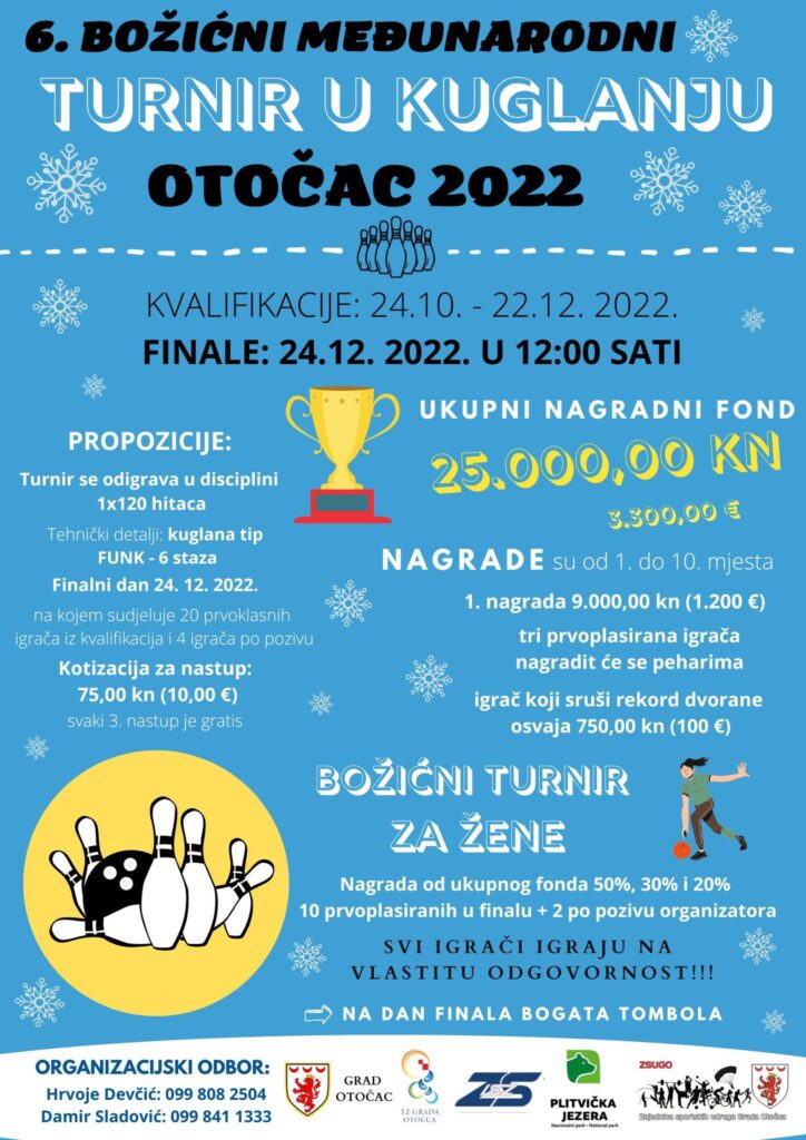 OTOČAC – U gradskoj kuglani Otočac i ove će se godine održati Božićni turnir u kuglanju “Otočac 2022” i to 6. po redu. Turnir je međunarodnog karaktera, a održava se u disciplini 1×120 hitaca (6 staza). Kvalifikacije će se odigravati od 24.10.2022. do 22.12.2022., dok će se finale održati 24.12.2021. (subota) od 12:00 sati. Ukupni nagradni fond je 25.000 kn.