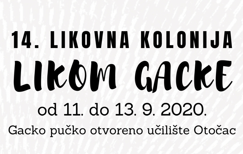 OTOČAC – Četrnaesta likovna kolonija LIKOM GACKE održat će od 11. do 13. rujna 2020. godine u Otočcu u organizaciji Gackog pučkog otvorenog učilišta, a prijaviti se možete od 01.7. .- 31.8.2020. i to putem emaila: gacko.pucko.otvoreno.uciliste@gmail.com ili na tel. 053/771-143.