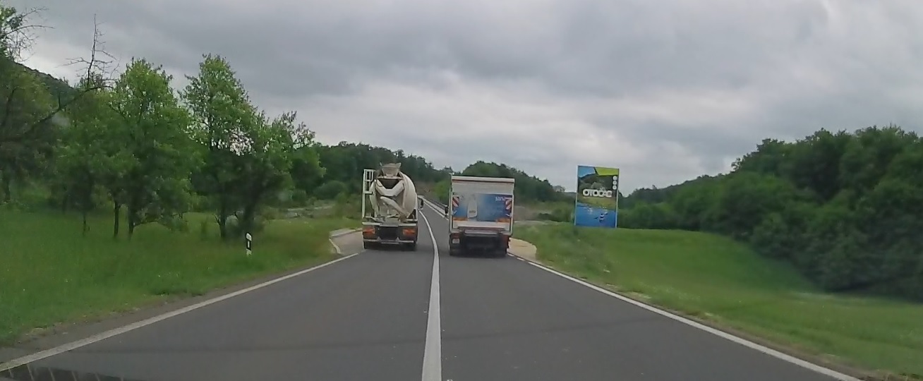 Snimili smo vozača četveroosovinskog miksera za beton točno na nadvožnjaku iznad autoceste prije ulaska u Otočac kako pretječe drugo teretno vozilo preko pune linije, dok mu ususret iz pravca Otočca dolaze vozila. Brzina miksera je u trenutku pretjecanja bila oko 100 km na sat.