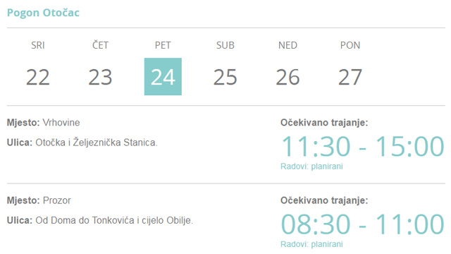 Također, bez struje biti će i Vrhovine i to Otočka ulica i Željeznička stanica u razdoblju od 11:30 – 15:00 sati.