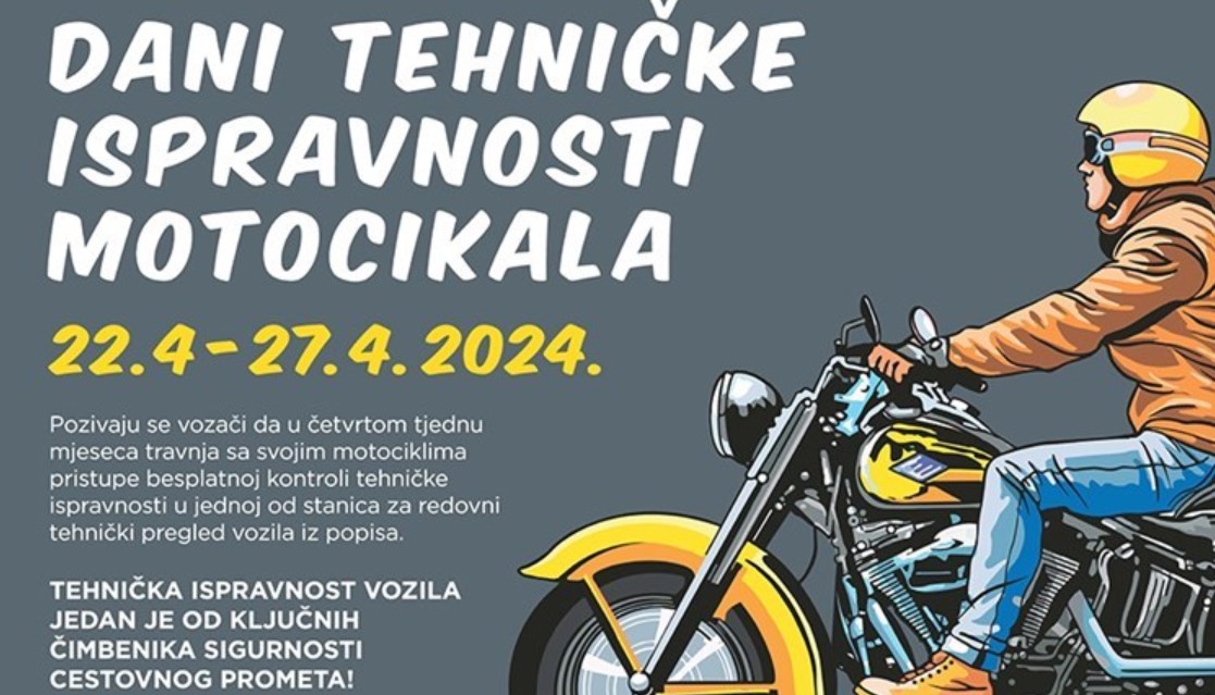 Od ponedjeljka, 22. travnja do subote, 27. travnja 2024. godine provodit će se preventivno-sigurnosna akcija „Dani tehničke ispravnosti motocikala”.