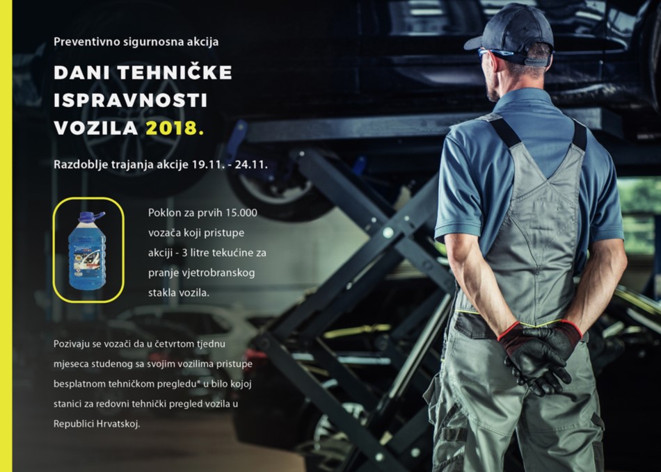 Preventivno-sigurnosna akcija naziva „Dani tehničke ispravnosti vozila 2018.“ provodit će se od 19. studenog (ponedjeljak) do 24. studenog (subota) na cijelom teritoriju Republike Hrvatske, u svim stanicama za redovni tehnički pregled vozila.