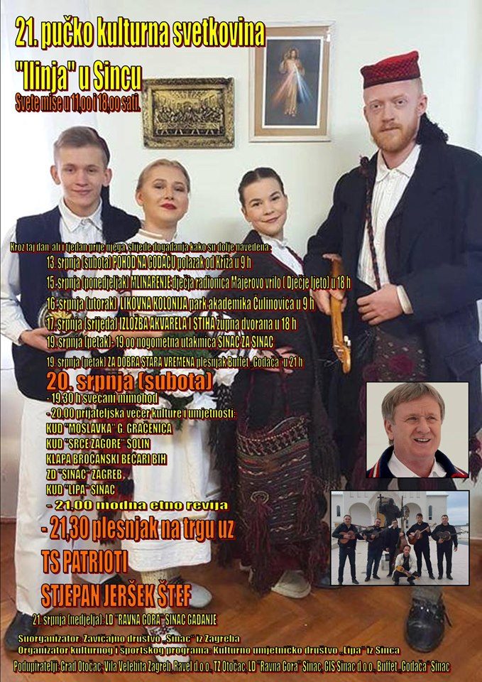 OTOČAC / SINAC – Svetkovina Ilinje, odnosno blagdana sv. Ilije proroka u Sincu proslaviti će se 21. godinu za redom. Organizator kulturnih događanja je KUD “Lipa” iz sinca uz suorganizaciju ZD-a “Sinac” iz Zagreba. Središnje događanje će započeti 20. srpnja (subota), a započeti će Svetim misama u 11:00 i 18:00 sati te svečanim mimohodom u 19:30 sati.