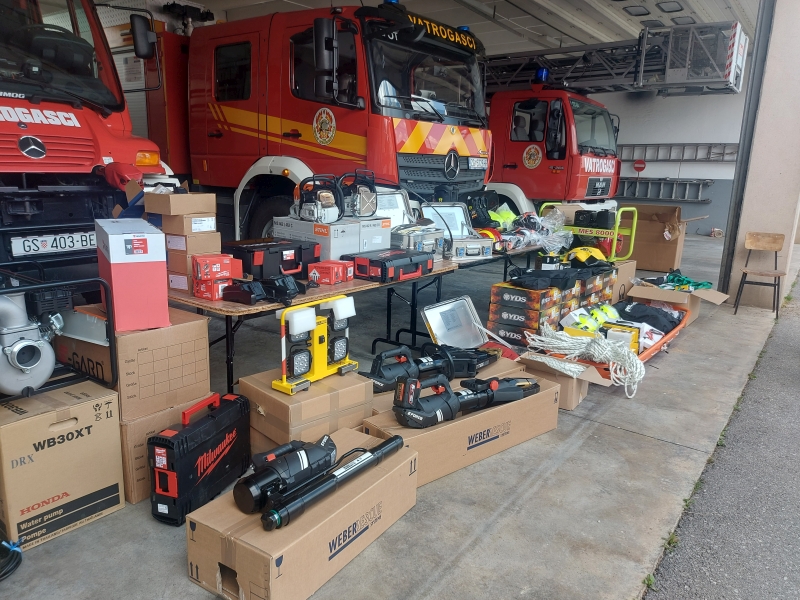 Riječ je o opremi za spašavanje građana- motorne pile, potopne pumpe i motorne pumpe, uniforma za strukturne požare, reflektori, škare za tehničke intervencije, agregati, dvodijelne ljestve, kukače, udarne bušilice, veze Motorole analogne, opasači, punjači za Motorole i oprema za spašavanje s visina i dubina.