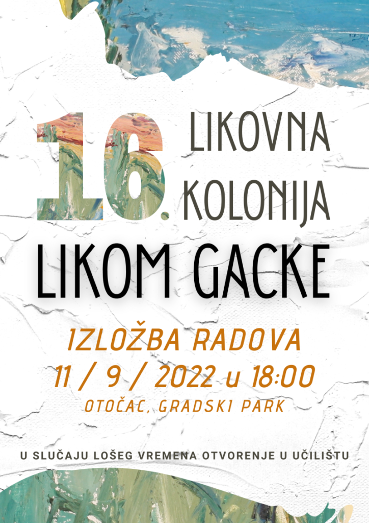 OTOČAC – Gacko pučko otvoreno učilište Otočac domaćin je 16. likovnoj koloniji LIKOM GACKE koja će se održati od 9. do 11. 9. 2022., a na kojoj će se okupiti  amaterski i profesionalni umjetnici iz različitih dijelova Hrvatske. Likovna kolonija organizirana je u suradnji s Udrugom željezničara slikara Plavo svjetlo iz Zagreba, uz potporu Ministarstva kulture i medija Republike Hrvatske i Grada Otočca.