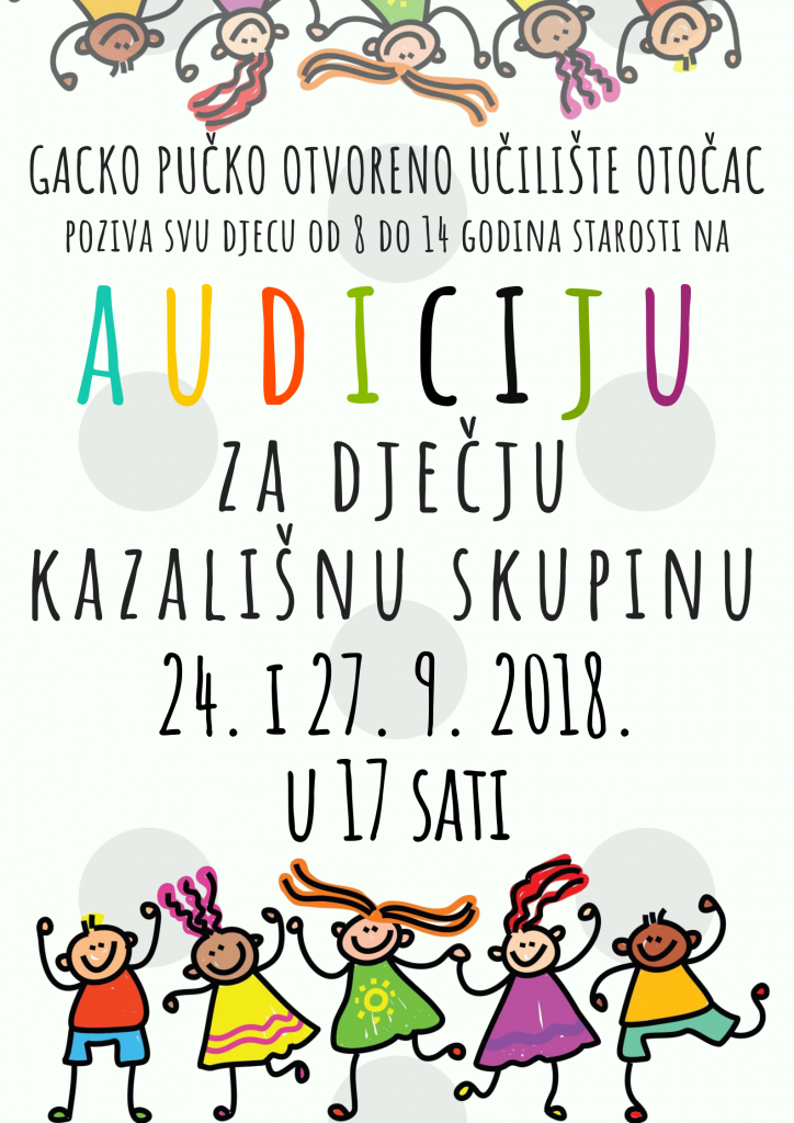 OTOČAC – Pod motom “Zamisli, doživi, izrazi!” Gacko pučko otvoreno učilište Otočac u okviru svojih aktivnosti osniva Dječju kazališnu skupinu i obavještava zainteresiranu djecu da se uključe. Uključiti se mogu sva djeca od 8 do 14 godina starosti, a audicija će se održati 24. i 27. rujna u 17:00 sati u prostorijama Gackog pučkog otvorenog učilišta Otočac.