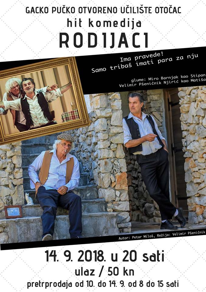 OTOČAC – Hit komedija “Rodijaci” gostovat će u Otočcu 14. rujna 2018. s početkom u 20:00 sati u velikoj dvorani Gackog pučkog otvorenog učilišta Otočac. U ovoj jednosatnoj komediji gledatelji imaju prilike pratiti zgode dvojice tipičnih hercegovačkih gastarbajtera – rođaka Stipe i Grge – koji se nalaze na radu u Njemačkoj.