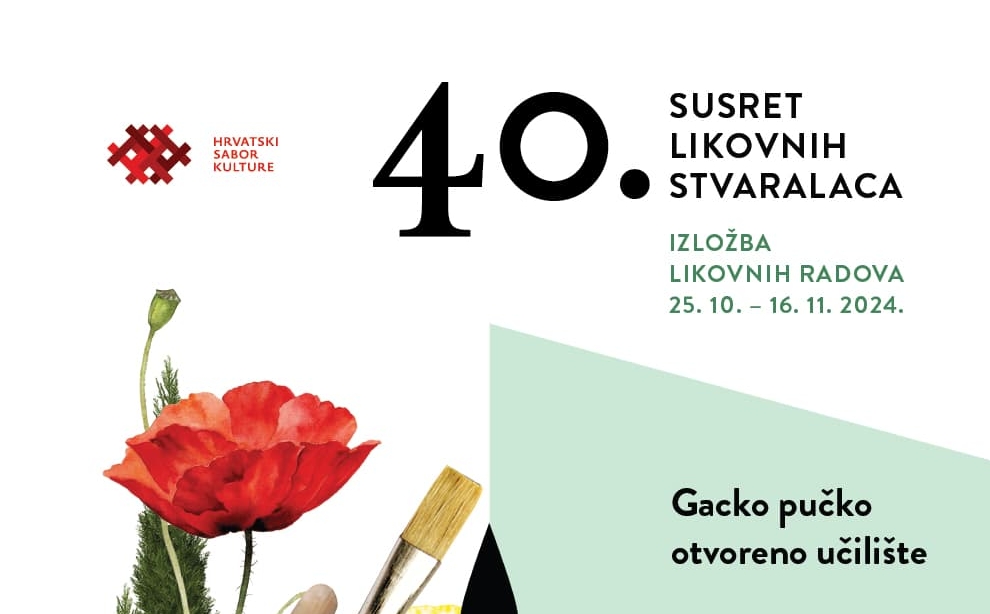 OTOČAC – 40. izdanje Susreta likovnih stvaralaca, likovne manifestacije koju organizira Hrvatski sabor kulture i koja svake godine okuplja hrvatske likovne udruge i najuspješnije autore, ove se godine održava u Otočcu u Gackom pučkom otvorenom učilištu, gdje će započeti 25. listopada 2024. u 19 sati otvorenjem izložbe u maloj dvorani na katu zgrade.