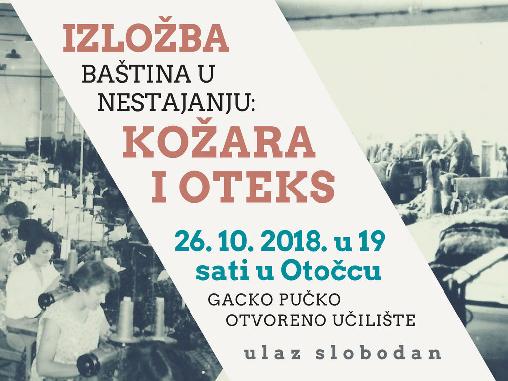 OTOČAC – U maloj dvorani na katu Gackog pučkog otvorenog učilišta u Otočcu 26. listopada 2018. u 19 sati bit će otvorena druga izložba iz ciklusa posvećenog industrijskoj baštini grada Otočca – izložba o Industriji kože Otočac i tekstilnoj industriji Oteks. Izložba Baština u nestajanju: Kožara i Oteks bavit će se nastankom i razvojem spomenutih industrijskih pogona, gospodarskim razvojem Otočca u 20. stoljeću, ali i razvojem tekstilne i kožarske industrije u Hrvatskoj i svijetu.