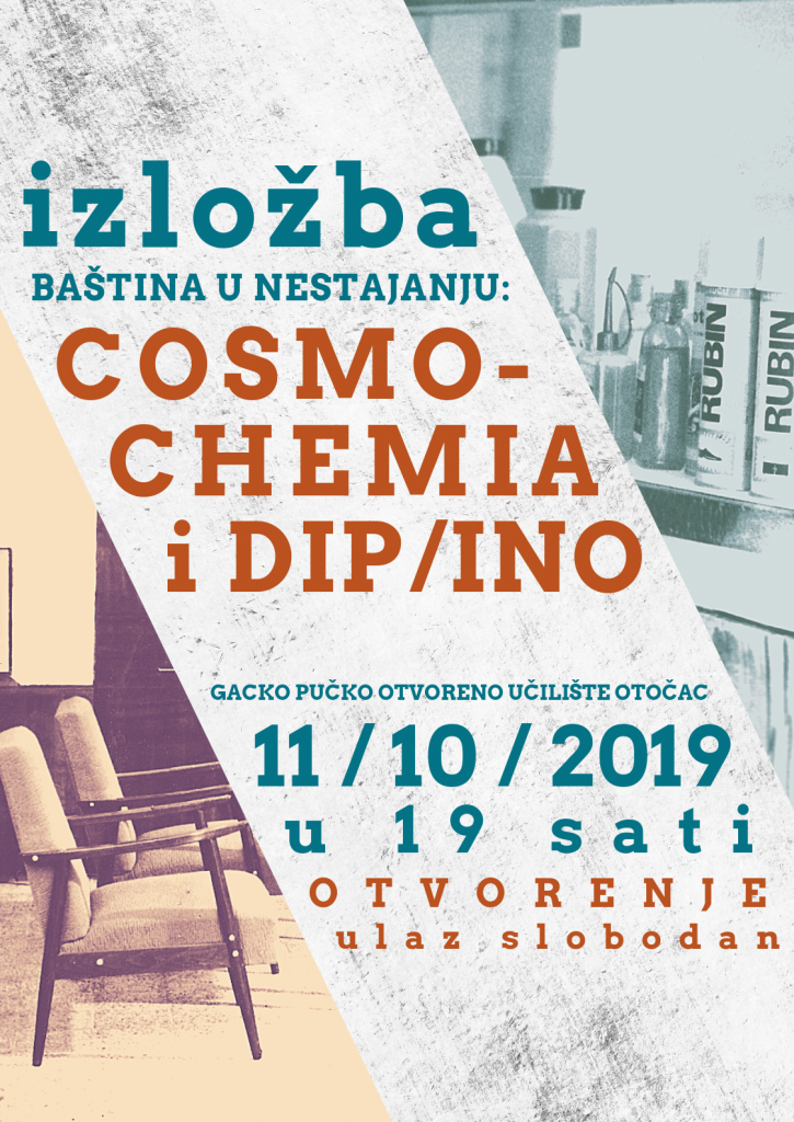 OTOČAC – Treća izložba iz ciklusa posvećenog industrijskoj baštini grada Otočca bavi se kemijskom i drvnom industrijom, a bit će otvorena 11. 10. 2019. u 19 sati u maloj dvorani na katu Gackog pučkog otvorenog učilišta Otočac. Izložba Baština u nestajanju: Cosmochemia i DIP/INO bavi se nastankom i razvojem spomenutih industrijskih pogona te razvojem kemijske i drvne industrije u Hrvatskoj i svijetu, a prezentirat će i brojne industrijske proizvode koji su u Otočcu nastajali tijekom druge polovice 20. stoljeća.