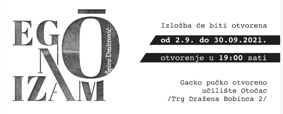 OTOČAC – Ego(no)izam je naziv izložbe crteža Špire Dmitrovića koja će u Otočcu u Gackomu pučkom otvorenom učilištu biti otvorena 2. rujna 2021. (četvrtak) u 19 sati. Izložba zanimljivog naziva – Ego(no)izam – govori o pojavi koja je neodvojiva od čovjeka – o pogreškama proizišlima iz egoizma, ali i o još jednoj pojavi koja je istinski ljudska – o potrebi da se na egoizam ukaže, a pogreške pokuša ispraviti. Ova izložba dio je ciklusa Lokalni umjetnici u Muzeju kroz koji se od 2014. godine predstavljaju lokalni autori, a obuhvatit će 24 crteža nastala u tehnici poentilizma i jednu drvenu skulpturu.