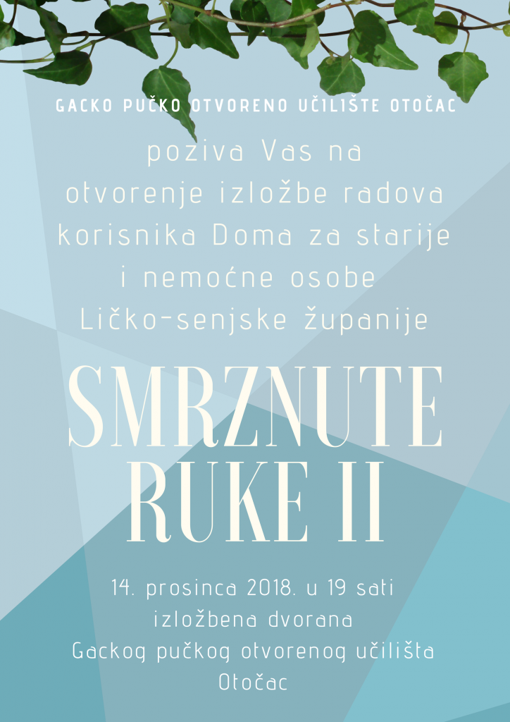 OTOČAC – Smrznute ruke II naziv je izložbe radova korisnika Doma za starije i nemoćne osobe Ličko-senjske županije koja će 14. prosinca 2018. u 19 sati biti otvorena u izložbenoj dvorani Gackog pučkog otvorenog učilišta Otočac. Na izložbi će biti izloženi radovi blagdanske tematike koje su korisnici izradili u sklopu radionica, a sudjelovat će korisnici otočke i gospićke podružnice Doma za starije i nemoćne osobe. Ulaz je slobodan!