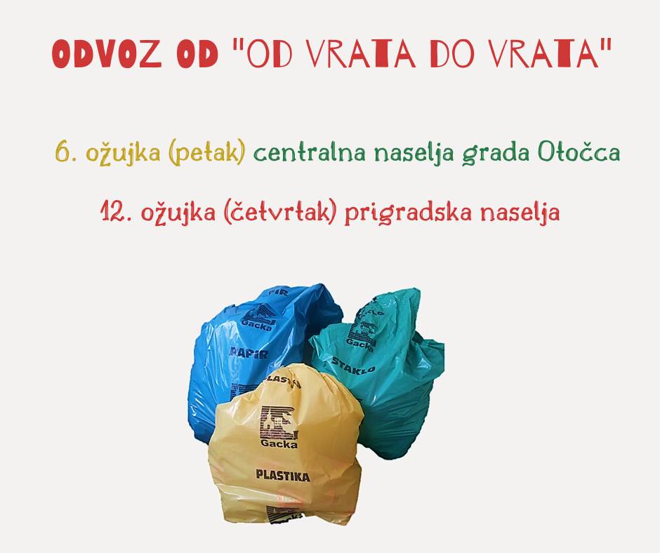 OTOČAC – Poduzeće Gacka d.o.o. Otočac obavještava korisnike usluga da će se zbog tehničkih poteškoća, odvoz selektvinog otpada iz prigradskih naselja (sela) obaviti sljedeći tjedan, odnosno 12. ožujka (četvrtak).
