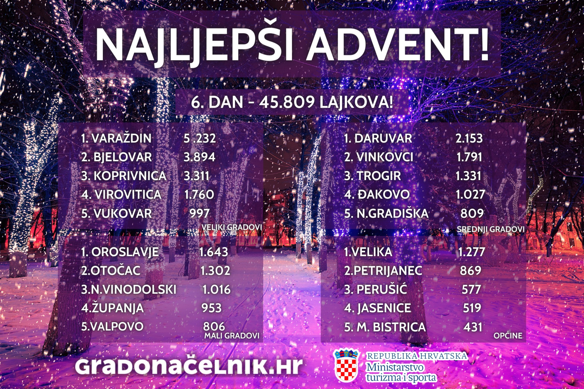 Preostala su još dva dana u kojima na FB stranici Gradonačelnik.hr možete dati glas za najljepši Advent u Hrvatskoj. U 6. danu prikupljeno je gotovo 46.000 lajkova. U kategoriji velikih gradova vodi Varaždin, zatim Oroslavlje u kategoriji malih gradova, Daruvar u kategoriji srednjih gradova te Velika u kategoriji općina.