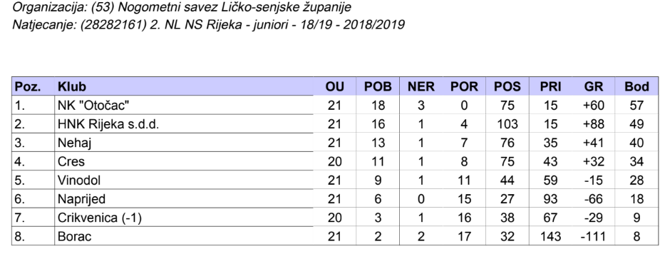 OTOČAC – U nedjelju 19.05.2019. godine završeno je prvenstvo juniora NK Otočac u 2. NL središta Rijeka. Juniorska momčad NK Otočac uvjerljivo je osvojila naslov prvaka ispred druge momčadi juniora HNK Rijeka, što predstavlja veliki uspjeh, pošto je HNK Rijeka najveći i najbolji klub u našem središtu. Ovaj uspjeh je dugogodišnji rad našeg trenera prof. Antonia Rudelića u nogometu, koji danas nastavlja svoje školovanje na nogometnoj akademiji HNS-a u Zagrebu.