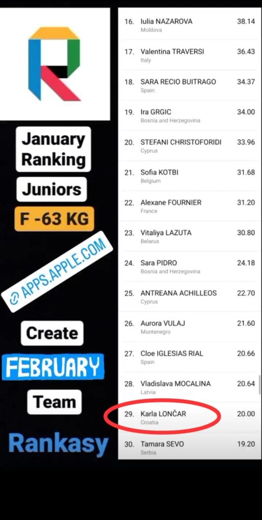 Iz svijeta sporta stiže lijepa vijest. Na stranici Europske taekwondo federacije europeantaekwondounion.org objavljena je svjetska rang lista juniora prema ocjenjivačkoj kategoriji Kyorugi. Karla Lončar, članica taekwondo kluba Gacka u kategoriji juniorki -63 kg na TOP 50 ljestvici zauzela je visoko 29. mjesto! Veliko je to priznanje Karli i treneru kluba Nikoli Pemperu. Čestitamo!