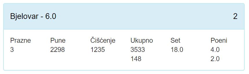 BJELOVAR – Jučer je u gradskoj kuglani u Bjelovaru odigrana kuglačka utakmica 12. kola prve HKL između otočkog KK Velebit i domaćina KK Bjelovar. Utakmica je završila uvjerljivom pobjedom domaćina rezultatom 2:6 za KK Bjelovar, odnosno u čunjevima 3385:3533.
