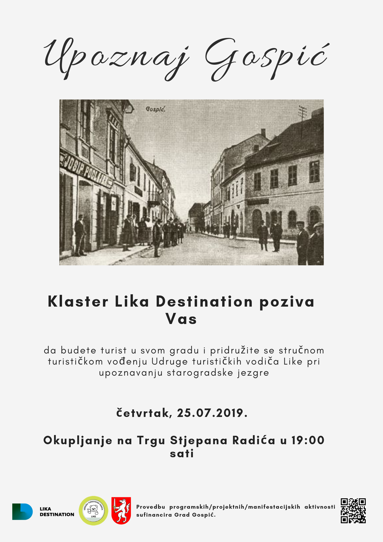 GOSPIĆ – Klaster Lika Destination 25. srpnja 2019. godine organizira stručno turističko vođenje starogradskom jezgrom Grada Gospića pod nazivom „Upoznaj Gospić“, koje se održava kao aktivnost projekta „Turistički Grad Gospić“, a provedbu programskih/projektnih/manifestacijskih aktivnosti sufinancira Grad Gospić.