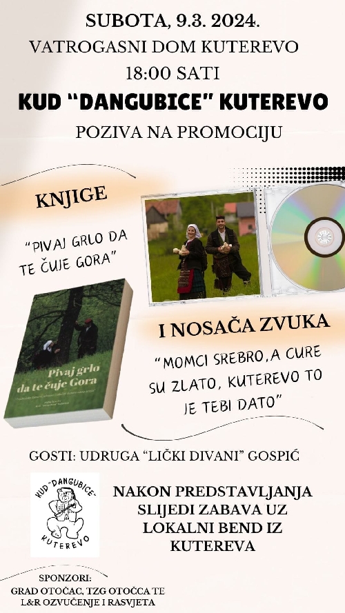 KUTEREVO – U subotu, 9. ožujka ,KUD”Dangubice” Kuterevo održati će promociju novog nosača zvuka “Momci srebro, a cure su zlato, Kuterevo to je tebi dato” i knjige “Pivaj grlo da te čuje gora”. Promocija će se održati u Vatrogasnom domu Kuterevo s početkom u 18:00 sati.
