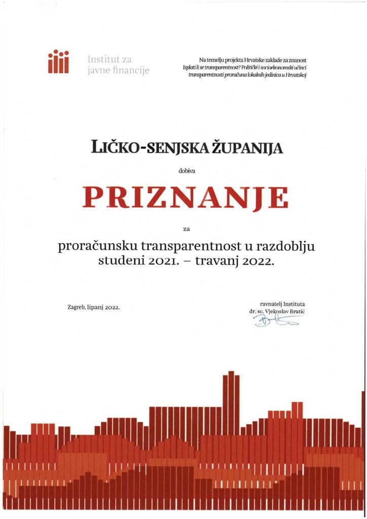 GOSPIĆ – Ličko–senjska županija dobila priznanje za transparentnost proračuna Institut za javne financije predstavio je 29. lipnja 2022. rezultate najnovijeg ciklusa istraživanja transparentnosti 576 proračuna županija, gradova i općina koje se provodi u okviru projekta Hrvatske zaklade za znanost “Isplati li se transparentnost?