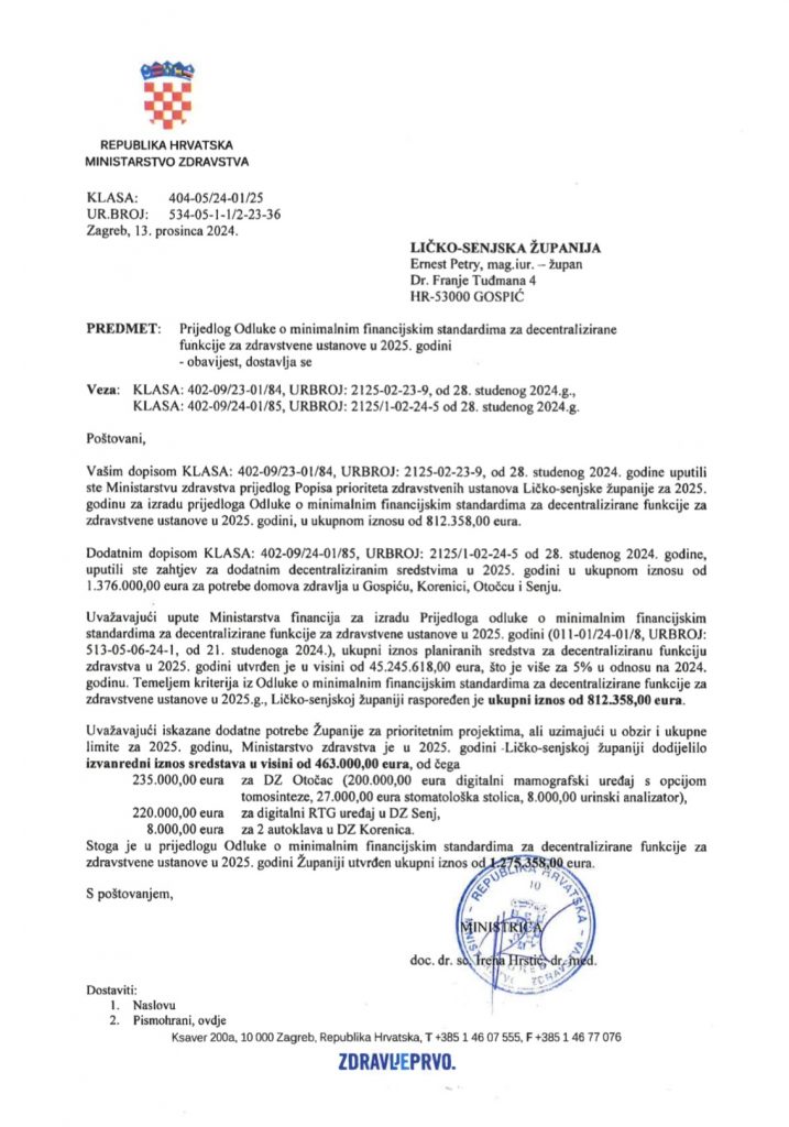 Ministarstvo zdravstva dodijelio je značajna sredstva domovima zdravlja u Ličko-senjskoj županiji. Prema Odluci o minimalnim financijskim standardima za decentralizirane funkcije za zdravstvene ustanove u 2025. godini, Ličko-senjskoj županiji nadležno ministarstvo osiguralo je redovna decentralizirana sredstava u iznosu od 812.358 eura.