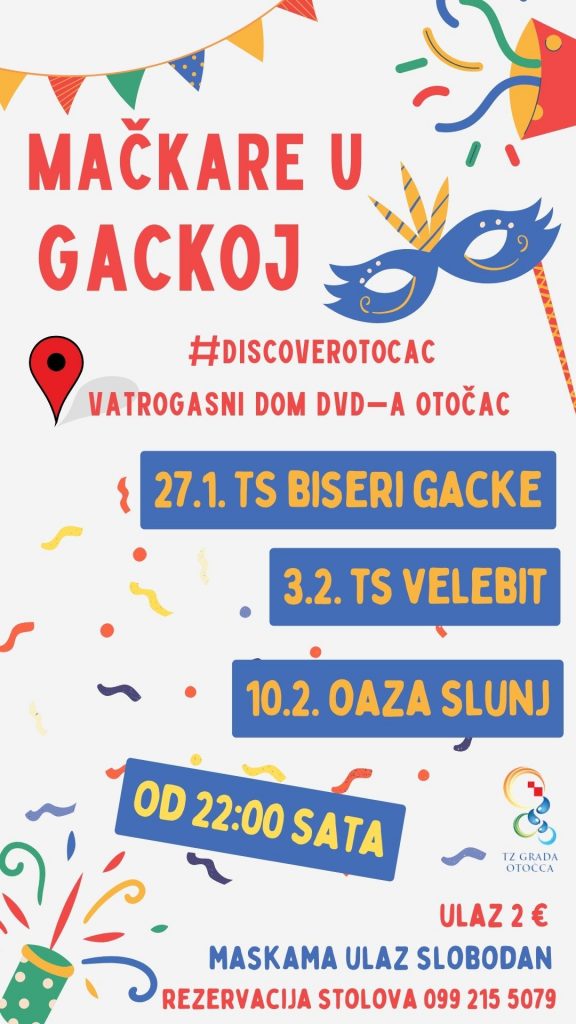 OTOČAC – Stiglo je najšarenije, najveselije i najluđe doba u godini – doba karnevala i maskenbala. Zaboravite na sve probleme, opustite se, maskirajte se, „obujte tuđe cipele“ barem na nekoliko sati i zabavite se na poznatim tradicionalnim Mačkarama u Gackoj. Ako ste ljubitelji kostima, šarenila, maski, plesa, smijeha i odlične atmosfere onda je idealno vrijeme da okupite svoju ekipu i pokažete svoje plesno, glumačko i ostalo umijeće. Ako niste ljubitelji maskiranja, a volite se zabavljati, jednako ste dobrodošli jer na ovim mačkarama sve je dozvoljeno.