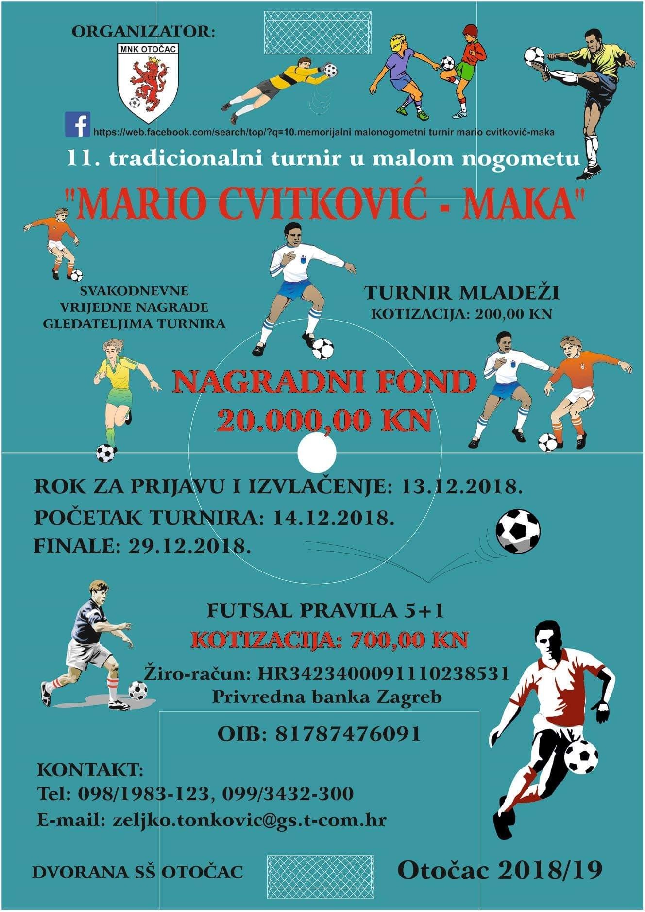 OTOČAC – Od 14. – 29. prosinca u dvorani SŠ Otočac održat će se 11. tradicionalni turnir u malom nogometu “Mario Cvitković – Maka”. Rok za prijavu ekipa je 13. 12.2018. godine, a ekipe će se natjecati za nagradni fond od 20 tisuća kuna. Kotizacija iznosi 700 kuna, a sve informacije mogu se dobiti na telefone 098/1983-123 i 099/3432-300 i na e-mail adresu: zeljko.tonkovic@gs.t-com.hr.