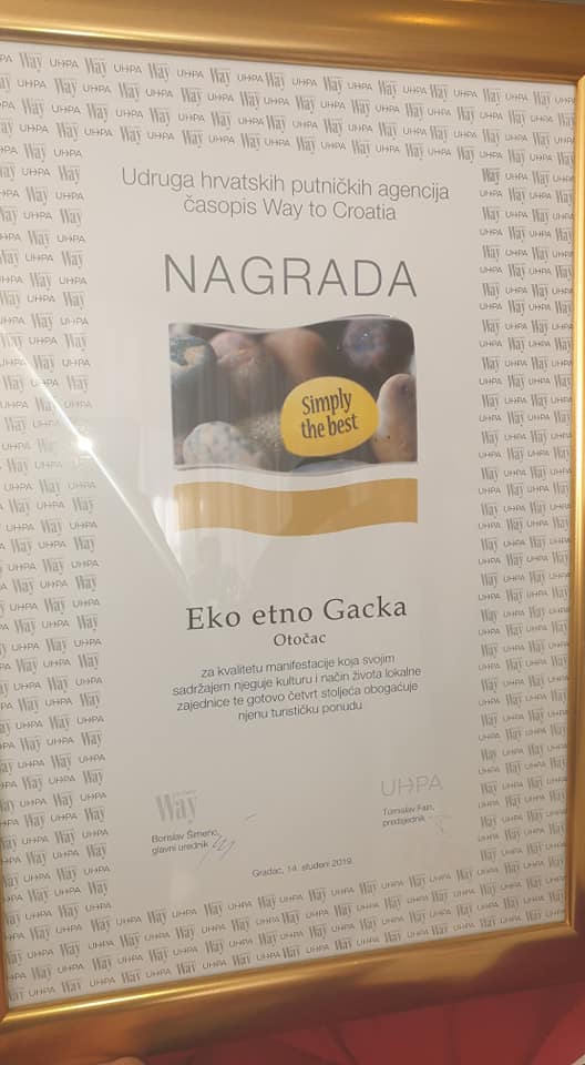 Manifestacija Eko etno Gacka je dobitnik nacionalne godišnje nagrade Simply the Best u kategoriji tradicijski običaji. Ovu nagradu, za kreativnost, inovativnost, razvoj i unapređenje turističke ponude destinacije, tradicionalno dodjeljuju UHPA – Udruga hrvatskih putničkih agencija i turistički časopis Way to Croatia.