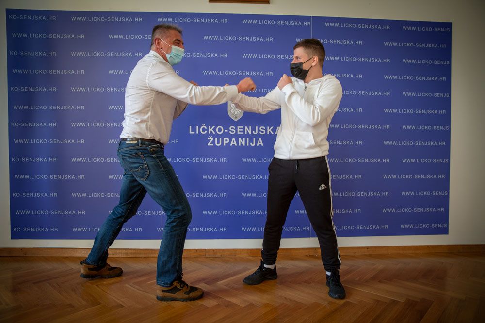 GOSPIĆ – Subota je i dok su još mnogi vjerojatno odmarali od proteklog tjedna u posteljama, županov radni dan je započeo u 6,30 h. U svom uredu primio je mladu boksačku nadu, Boksačkog kluba Gospić, Andriju Tomića i njegovog trenera i predsjednika Boksačkog kluba Gospić, Antonija Tomića. Povod prijema je današnji prvi nastup Andrije Tomića i izlazak na natjecanje u organizaciji Hrvatskog boksačkog saveza u Prvoj hrvatskoj boksačkoj ligi. Andrija i njegov trener jutros su krenuli put Zagreba na ovo prestižno natjecanje. Milinović im je kao dokazani sportaš ( i sam je majstor borilačkih vještina, karate) zaželio sretan put i puno uspjeha na današnjem natjecanju.