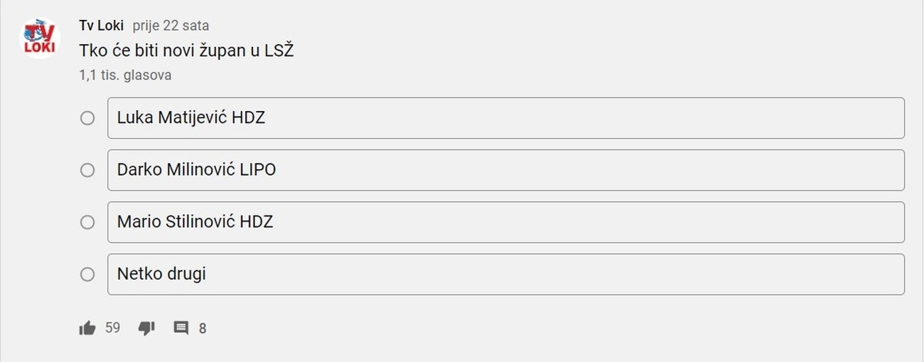 Jučer se na TV Loki pojavila anketa sa pitanjem “Tko će biti novi župan u LSŽ” sa imenima četiri kandidata: Luka Matijević, Darko Milinović, Mario Stilinović i Branislav Šutić. Tijekom današenjg dopodneva nekoliko nam je sugrađana javilo da je Šutićevo ime “nestalo” sa popisa potencijalnih kandidata nakon što je dobio svega par posto glasova.