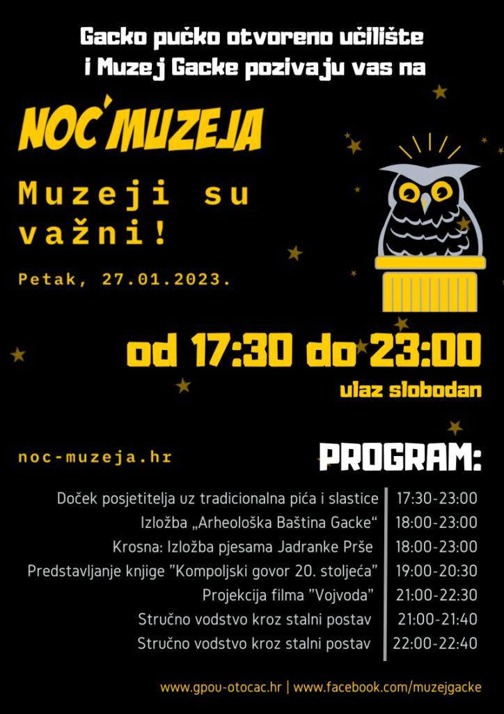 Stručna vodstva kroz stalni postav bit će organizirana u 21 i 22 sata. Muzej Gacke ostaje otvoren do 23 sata, a ulaz je slobodan.