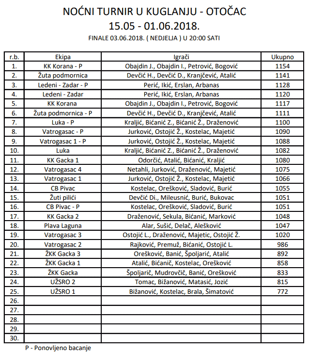 Noćni turnir u kuglanju – poredak