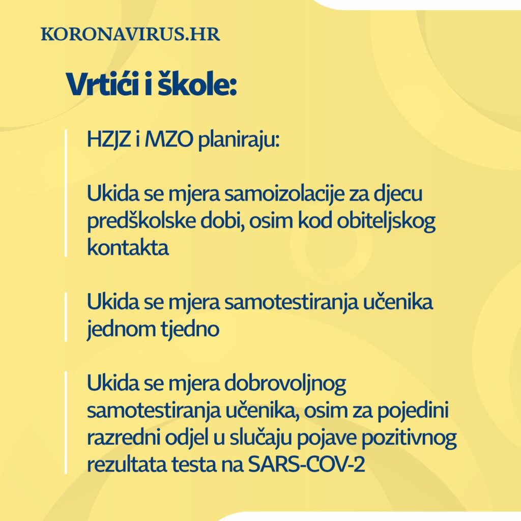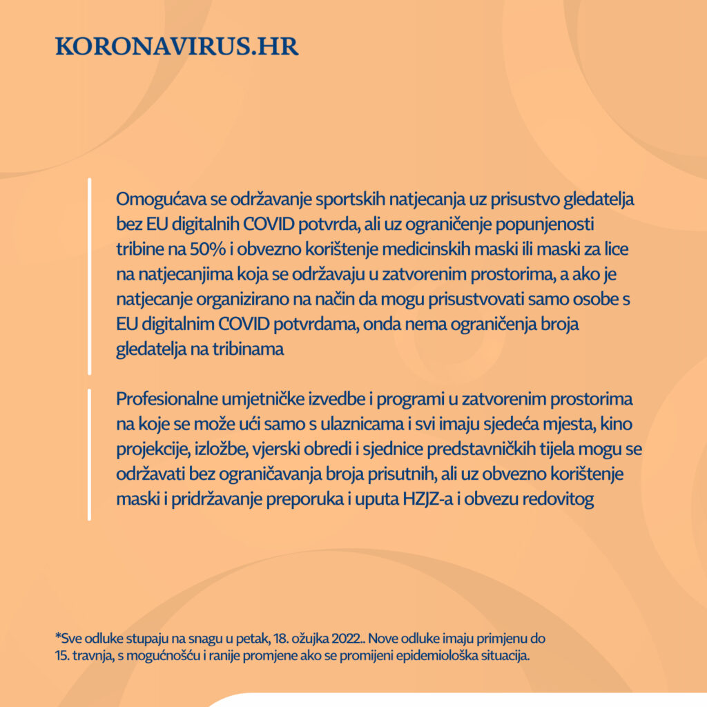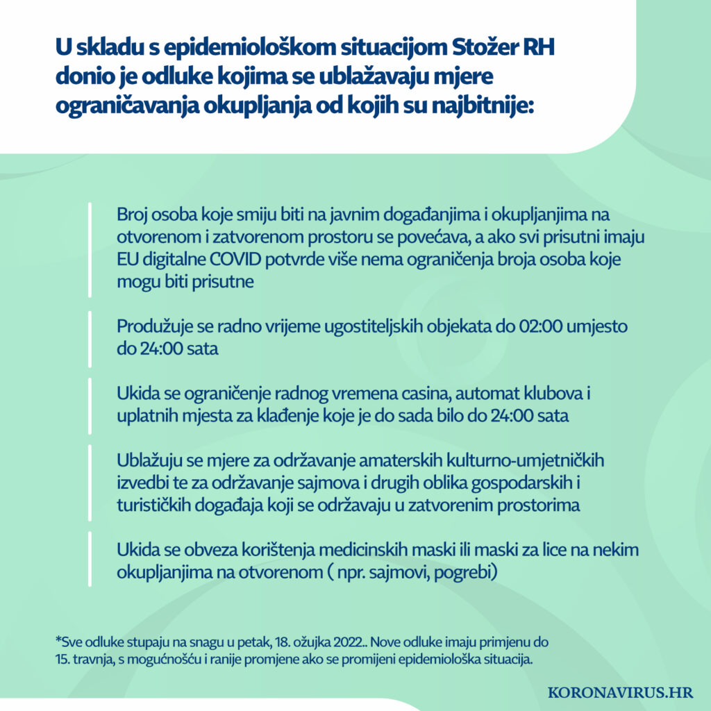 Vlada RH objavila je na službenim mrežnim stranicama vijest da se, zbog poboljšanja epidemiološke situacije i manjeg opterećena na zdravstveni sustav, produžuje radno vrijeme ugostiteljskih objekata do 2 sata ujutro. Također, ukida se ograničenje broja sudionika na javnim okupljanjima ako svi sudionici imaju COVID potvrde, kao i samotestiranje školaraca. Novost je i da se ukida obavezno korištenje medicinskih maski na nekim okupljanjima na otvorenom. Novo popuštanje mjera stupa na snagu danas, 18. ožujka 2022.