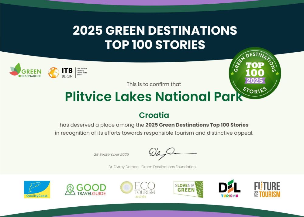 Na Green Destinations konferenciji održanoj od 28. do 30. rujna 2025. u Montpellieru u Francuskoj, Nacionalni park Plitvička jezera je pored zlatnog priznanja za održivost ušao i u Top 100 Green Destinations priča o održivosti.
