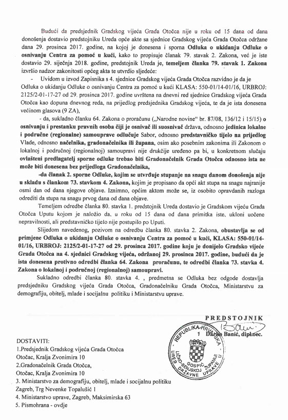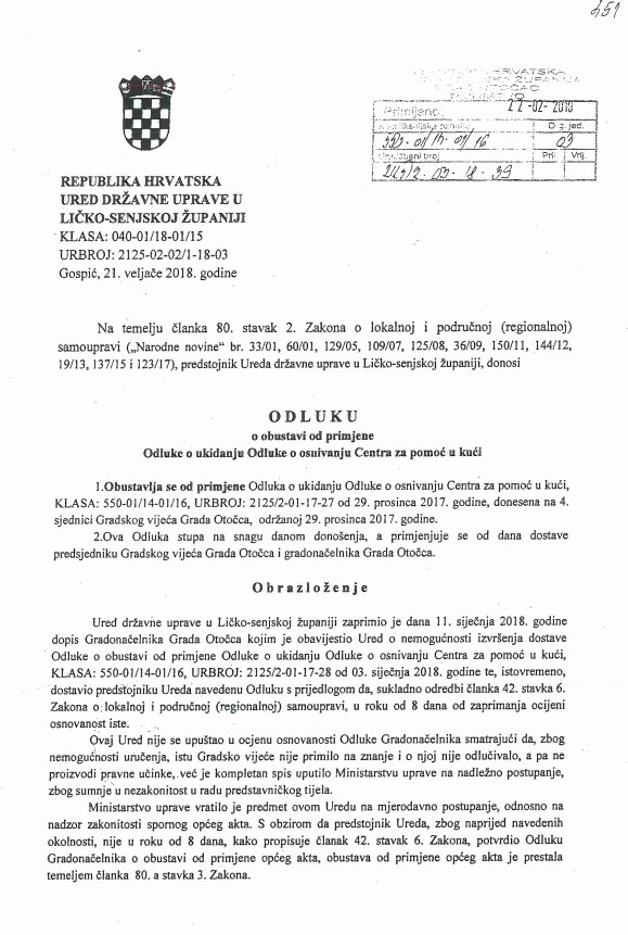 Podnosim priopćenje javnosti a naročito starijim osobama koji su i najviše zainteresirani za ovo priopćenje, a radi se o radu gradske ustanove Centar za pomoć u kući da je predstojnik Ureda državne uprave u ličko-senjskoj županiji donio Odluku o obustavi od primjene Odluke o ukidanju Odluke o osnivanju Centra za pomoć u kući. Drugim riječima Odluka koju je donijelo Gradsko vijeće da se ukine Centar za pomoć u kući je nezakonita, a sam postupak pokrenuo je gradonačelnik Stjepan Kostelac. Iz ovoga je vidljivo da se korisnici Centra ne moraju bojati da će im usluge biti uskraćene jer će se one obavljati na isti način kao i do sada. Također ističemo da ne nasjedate na širenje laži i neistina da djelatnici centra ne pružaju pravovaljano usluge kako su i ugovorene i u ovim otežanim okolnostima velikih snježnih padalina.