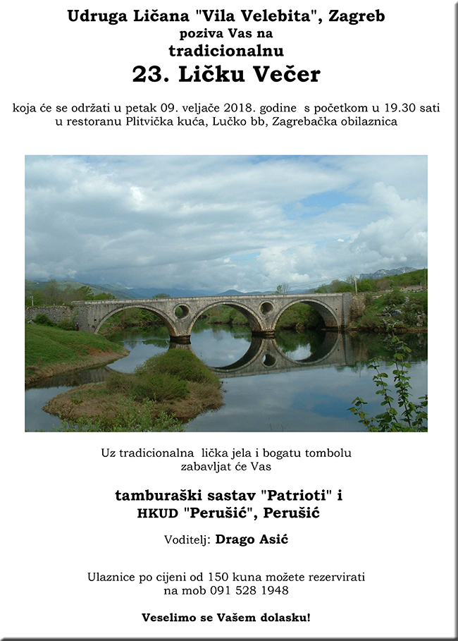 ZAGREB – U petak, u restoranu Plitvička kuća u Zagrebu, održati će se Lička večer i to po 23. put u organizaciji Udruge “Vila Velebita”. Uz bogata tradicionalna jela te bogatu tombolu, sudionike će zabavljati i tamburaški sastav “Patrioti” te HKUD “Perušić” . Sve informacije na tel. 091 528 1948.